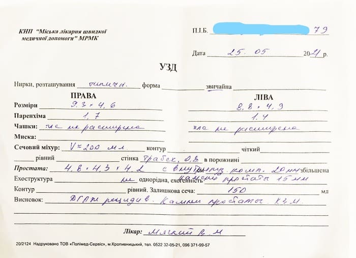 Операція була виконана 28.05.2021. під місцевою анестезією, доступом через прокол в правій стегновій артерії. Вже на протязі тижня зменшилась кількість походів в туалет по маленькому (вночі до 1 разу), полегшилось сечовиділення та покращилось самопочуття хворого.
