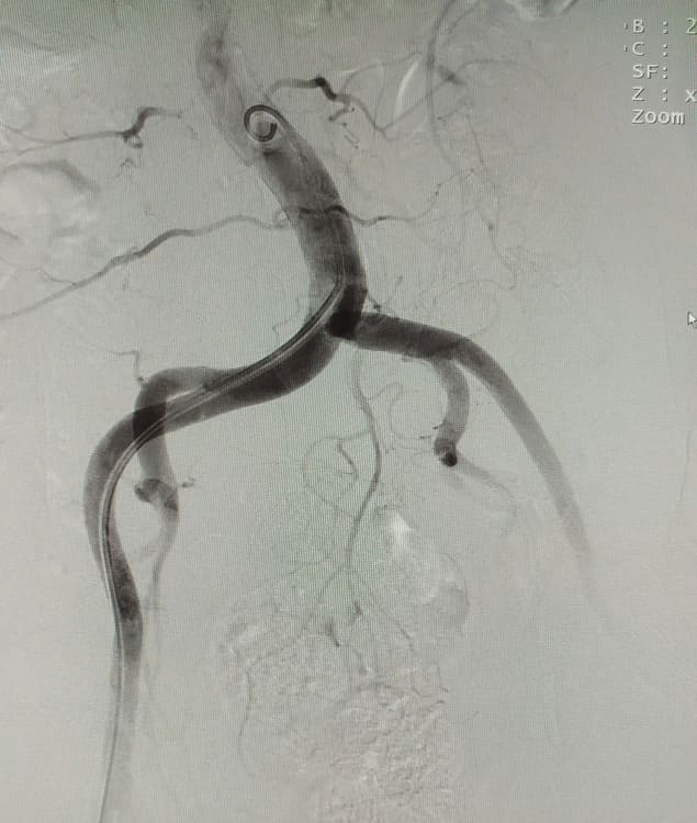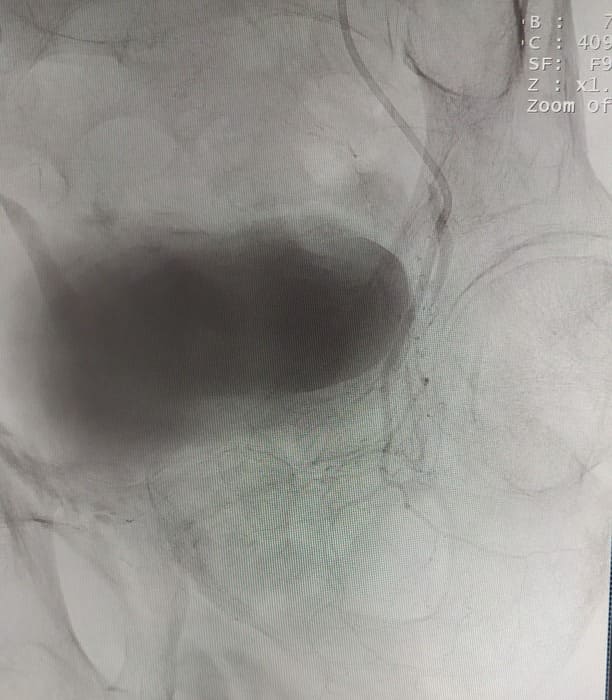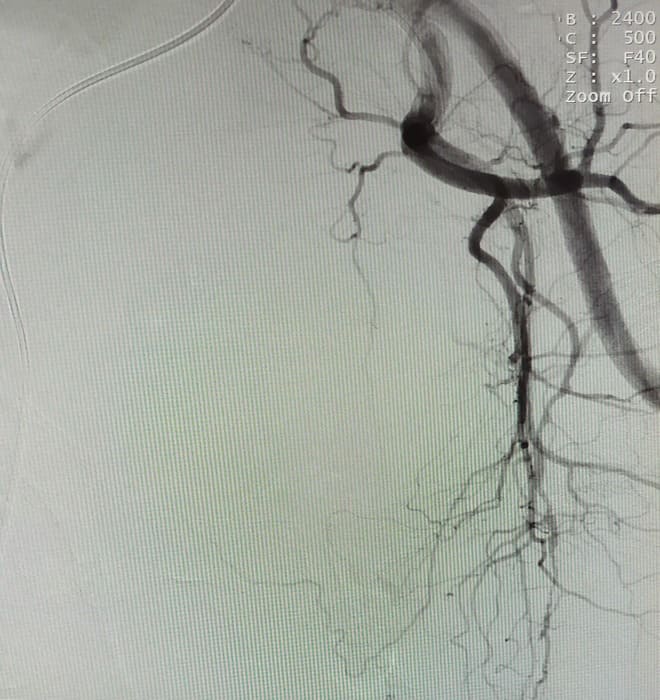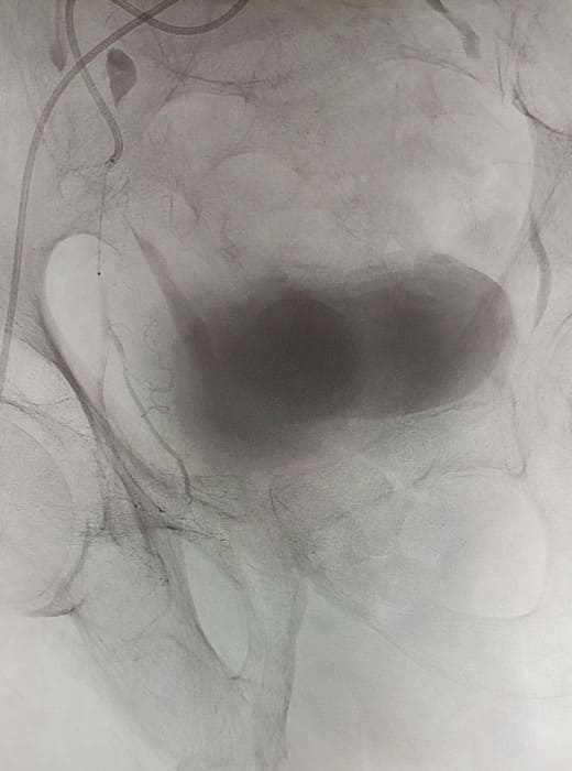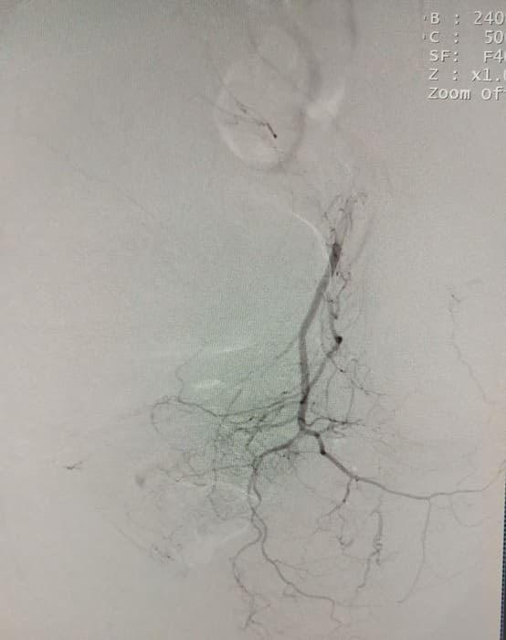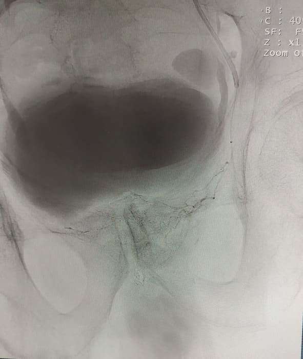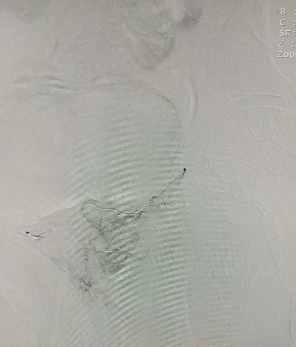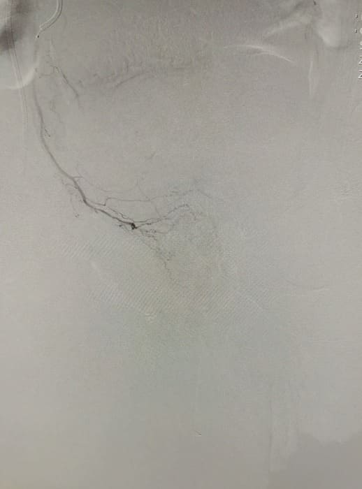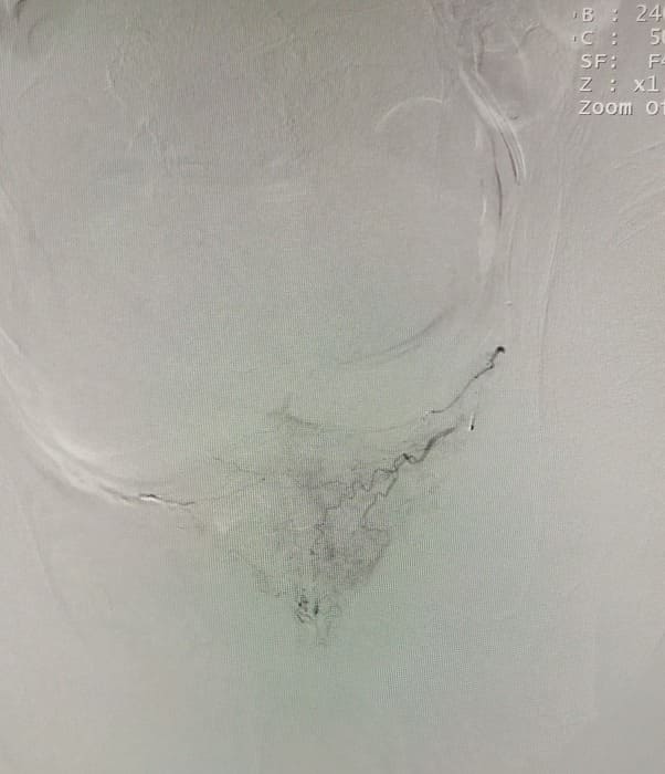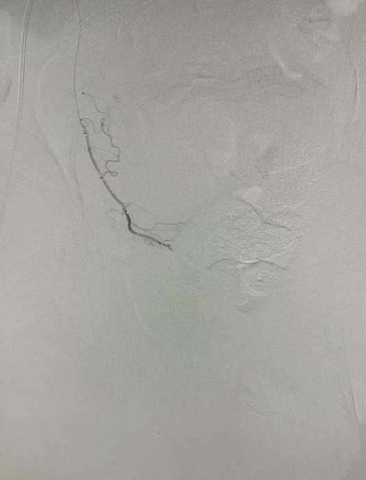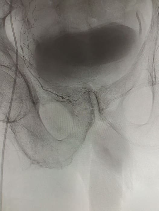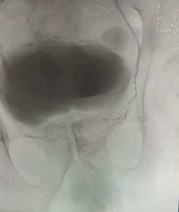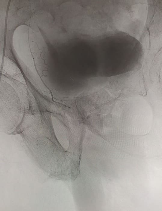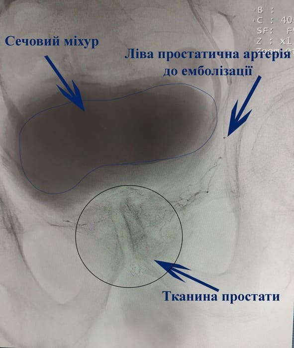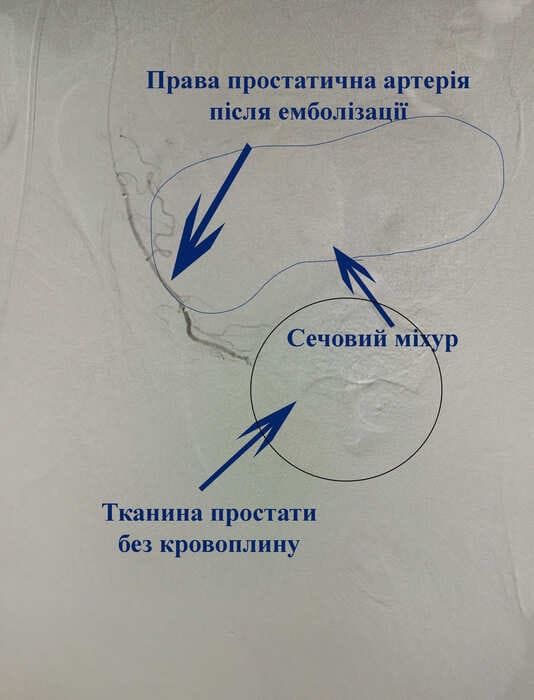 Зазвичай люди літнього віку мають вражені атеросклерозом та звивисті, внаслідок гіпертонічної хвороби судини. Цей випадок не був виключенням, тому нам довелося докласти максимум зусиль, використати високотехнологічне обладнання та інструменти, щоб віднайти цільові судини. На диво, незважаючи на попередню операцію, судинний малюнок рецидивної простати збігався з тим який буває у не оперованих пацієнтів. Тому нам вдалося їх чітко визначити з обох сторін та заповнити емболами. Це доволі кропітка праця, адже щоб викликати ішемію, необхідно поступово виключити кровоплин в усій тканині залози. Полегшувало операцію лише відсутність перетоків артерій на сусідні органи. Це дозволило нам безпечно емболізувати, не боячись негативних наслідків та ускладненнь.